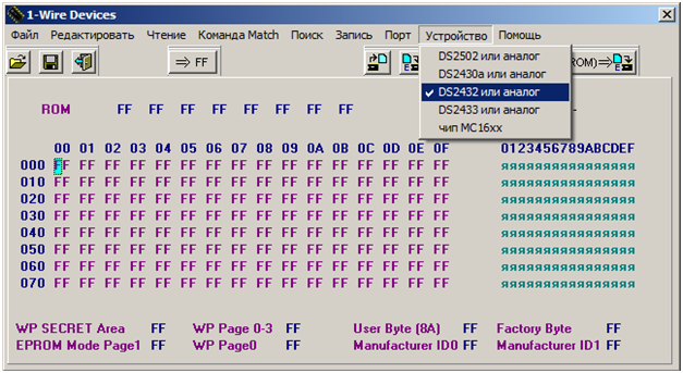4. Выбираем модель чипа, который собираемся прошивать. В нашем случае это DS2432.